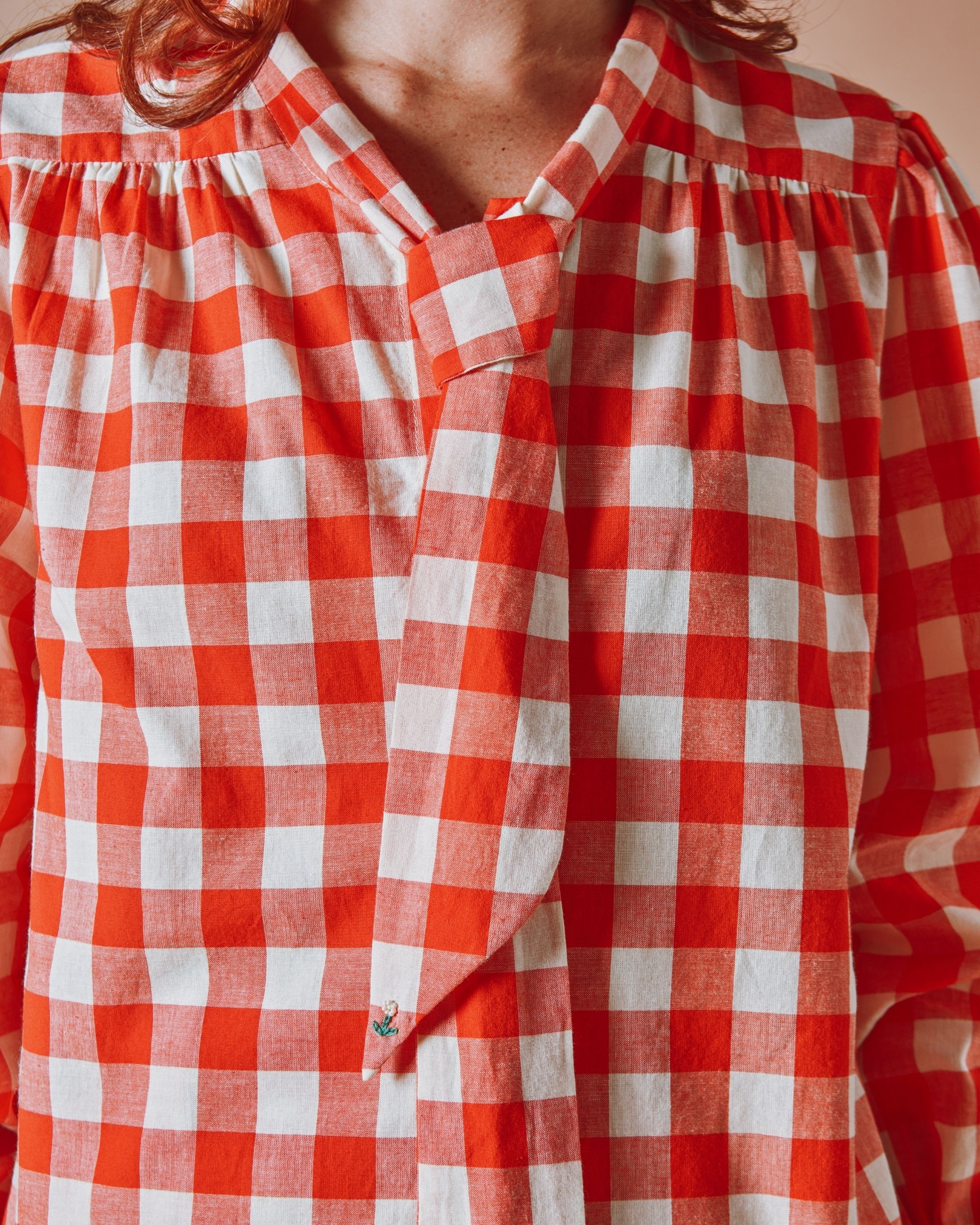Blouse col lavalière en coton bio vichy rouge et blanc.