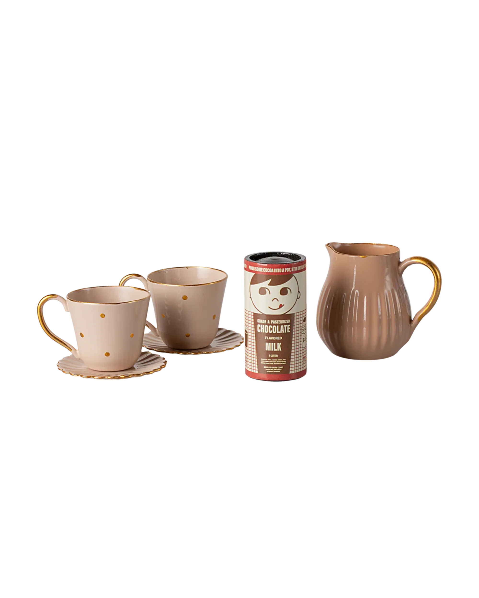 Il est temps d'inviter vos amis à déguster un chocolat chaud. Cet ensemble, contenant 2 tasses, 2 assiettes, une pichet et le chocolat, est disponible en taille mini pour la famille Teddy et en taille 1 et 2 pour les lapins et Bunnies.