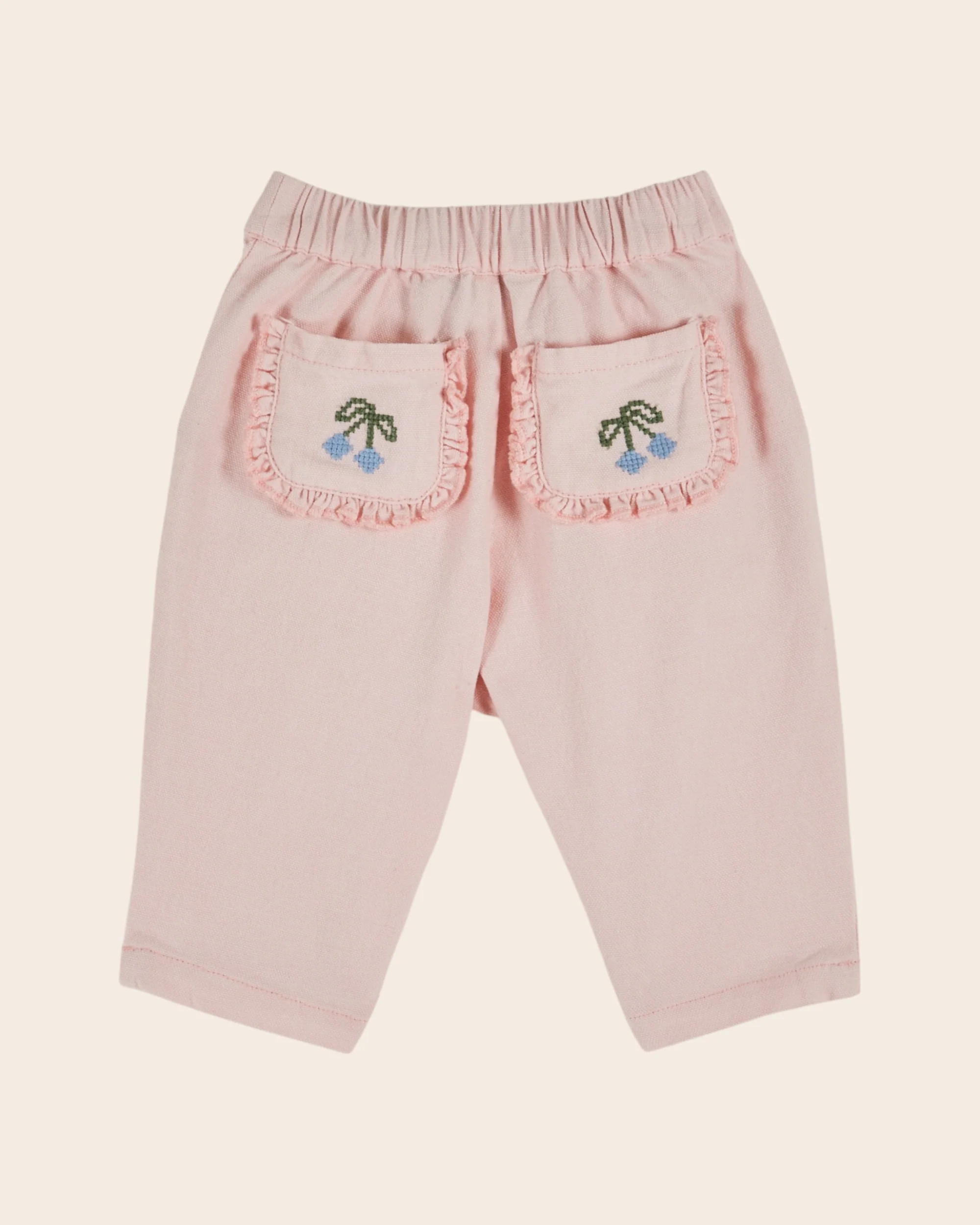 Pantalon en toile de coton rose. De mini cerises brodées animent le bord des poches italiennes et des cerises au point de croix égayent les poches plaquées et volantées du dos.