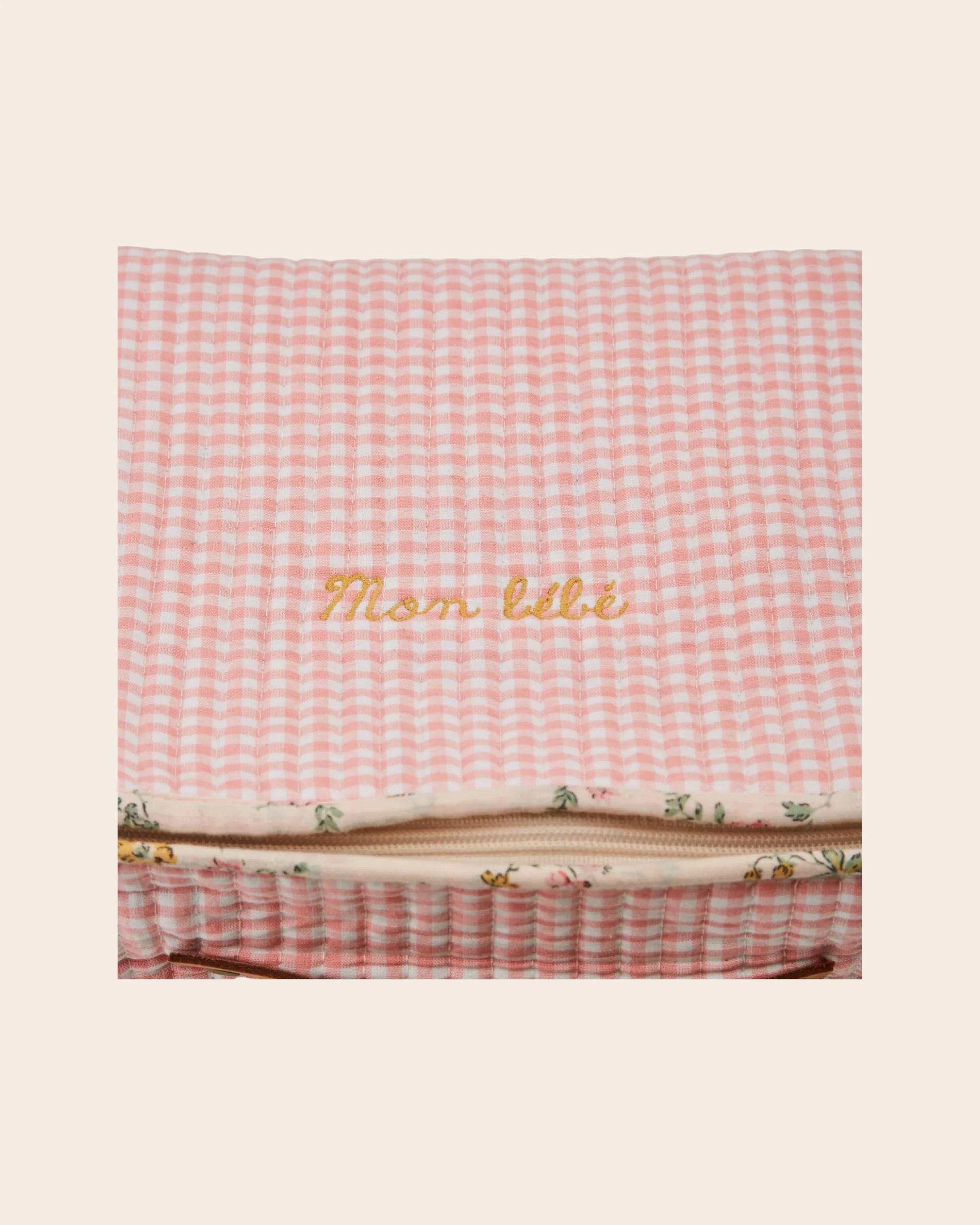 Valisette en coton bio vichy rose et blanc. Une broderie "Mon bébé" égaye le dessus.