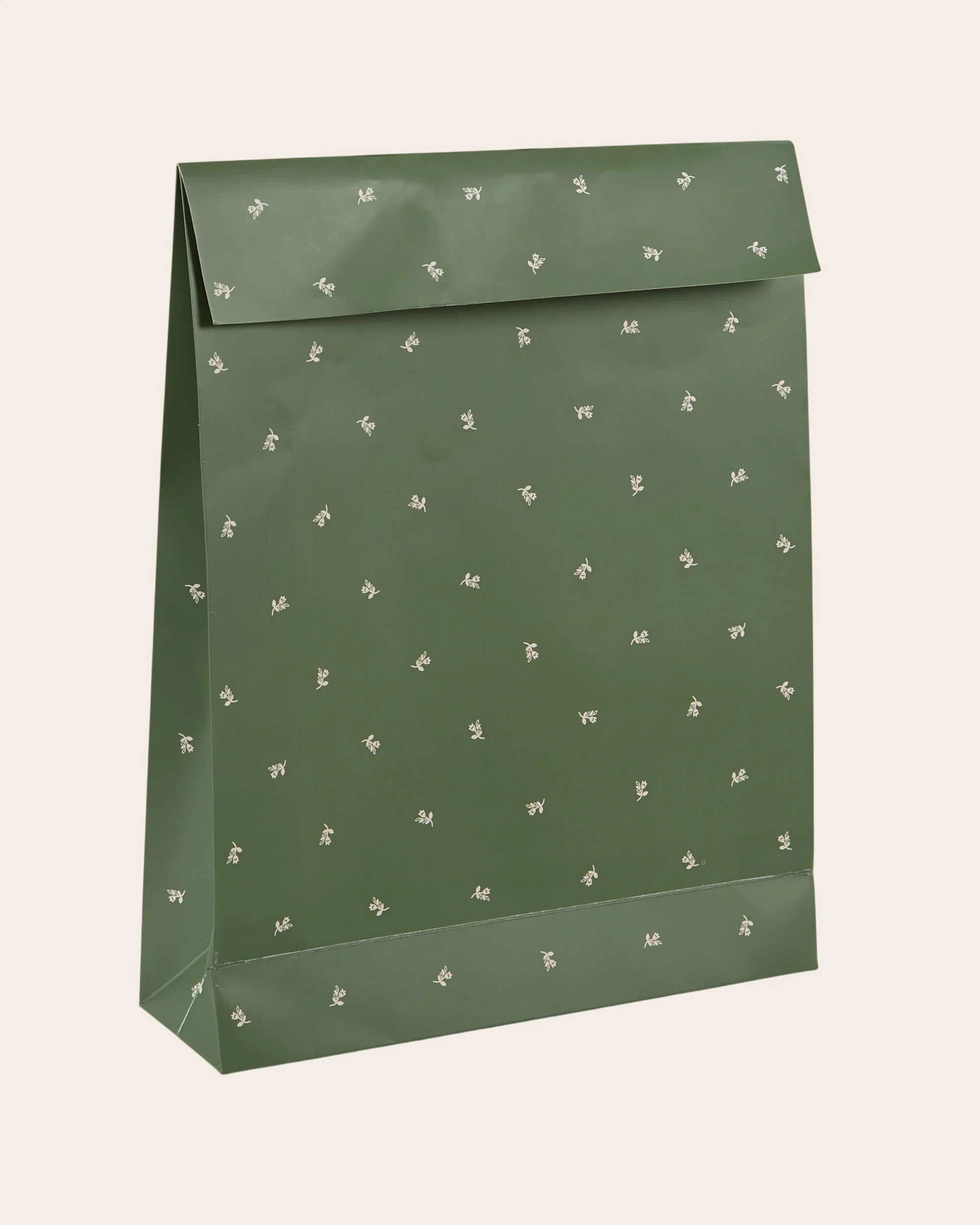 Pochette cadeau verte parsemée de jonquilles écrues. Fermeture adhésive au dos.