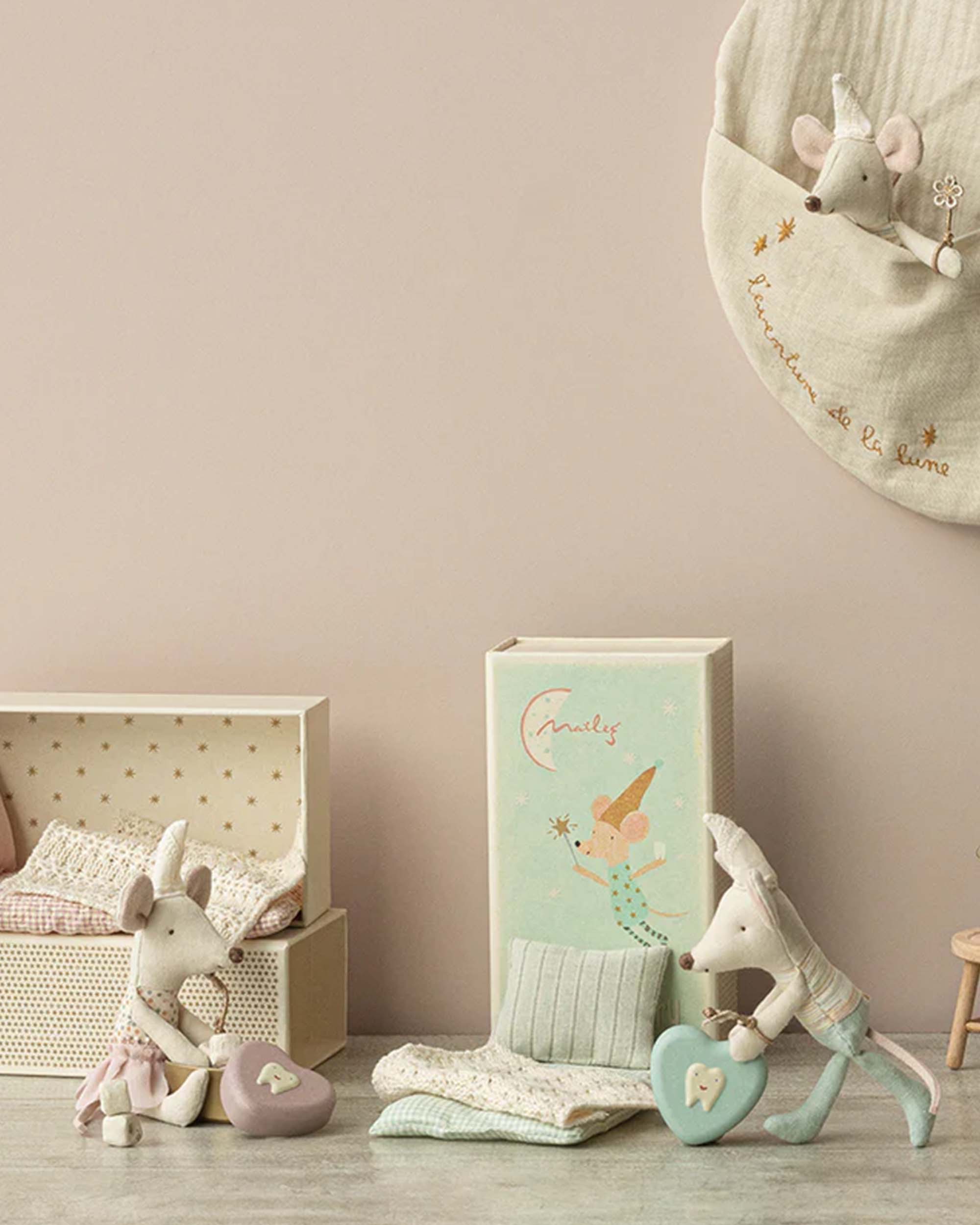 Il fait nuit, toute la famille dort ! La fée des dents, une charmante petite souris confectionnée en lin beige et rose à pois rose, va commencer sa tournée. Souricette sort de sa boîte en carton solide et joliment décorée. Elle enfile sa jupe en coton et lurex rose élastiquée à la taille, pose sur sa tête son chapeau pointu, passe les bretelles de son sac à dos, attrape sa baguette magique et disparait dans la nuit noire, à l'écoute du moindre bruit grâce à ses grandes oreilles toutes douces.