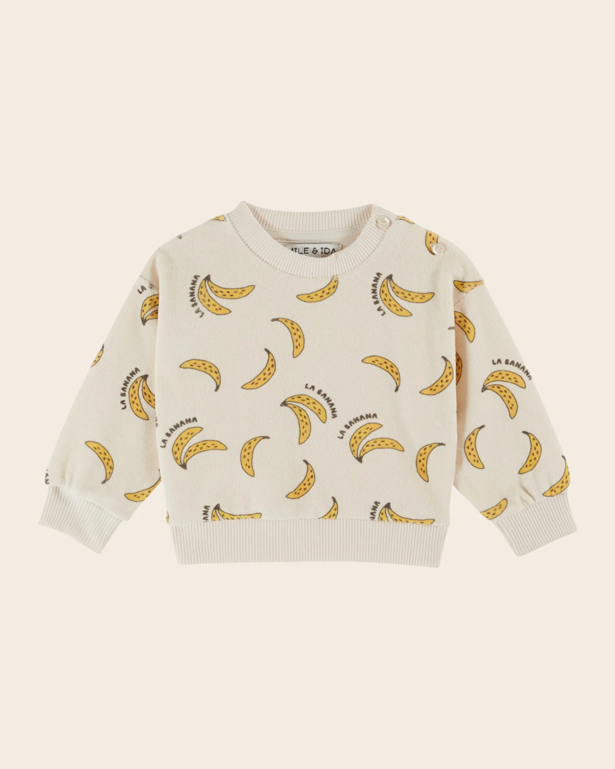 Sweatshirt en velours de coton biologique et fibres mélangées crème imprimé en all-over de bananes.