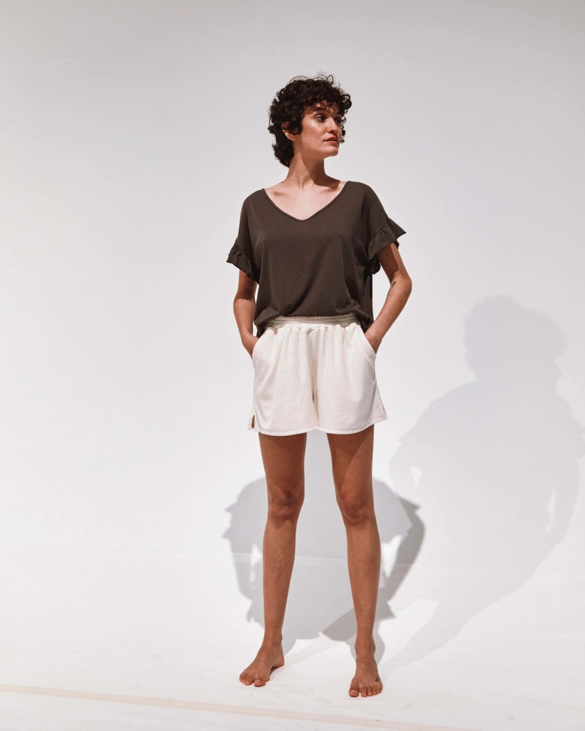 Tee-shirt en jersey de coton biologique bitume, une pièce intemporelle plébiscitée pour sa douceur exceptionnelle. Ce tee-shirt se distingue par sa coupe oversize et ses emmanchures décalées, finies par un délicat volant surfilé. Son décolleté en V, subtilement échancré, ajoute une touche de féminité discrète.