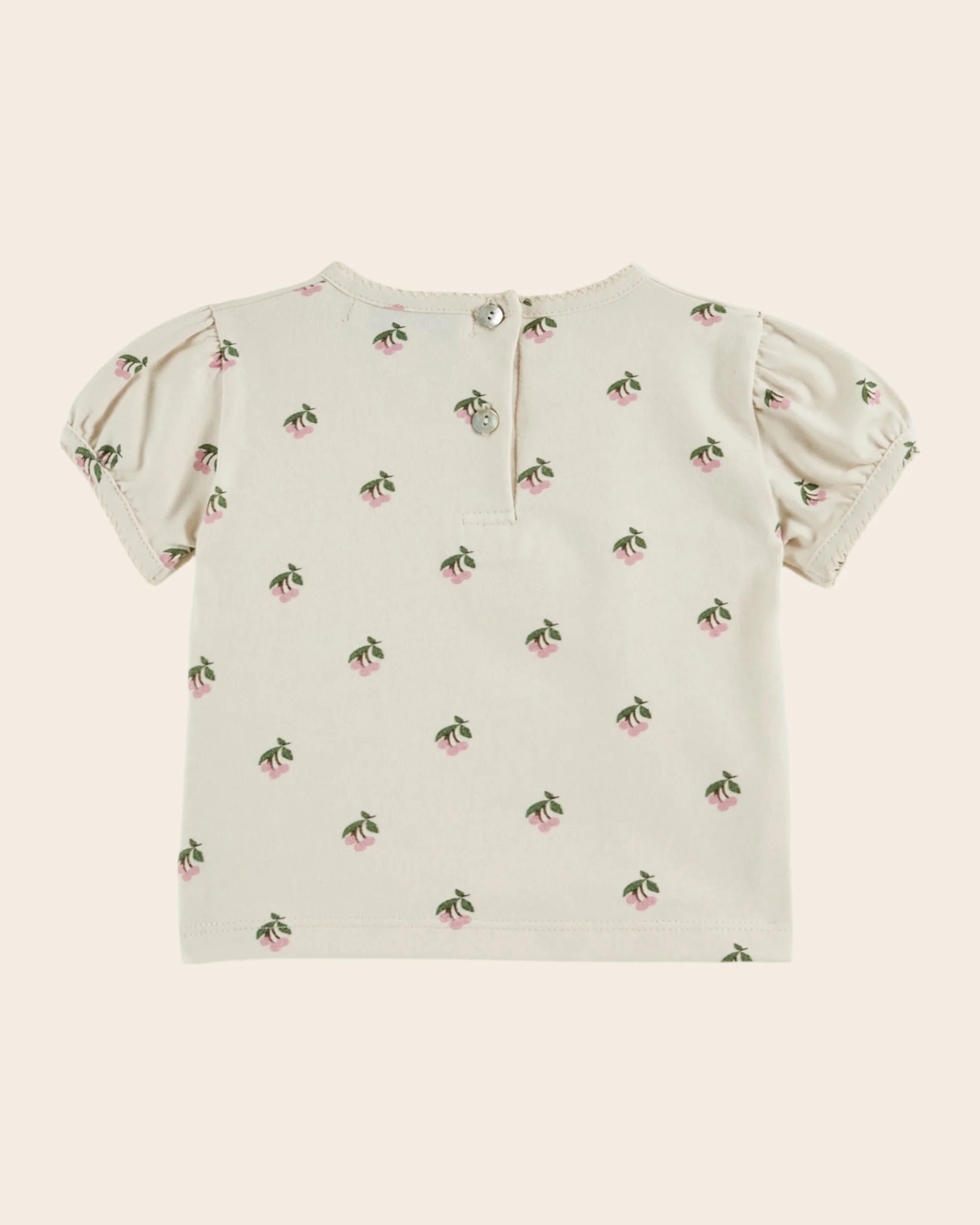 Tee-shirt bébé en jersey de coton biologique crème imprimé en all-over de mini bouquets de cerises roses.
