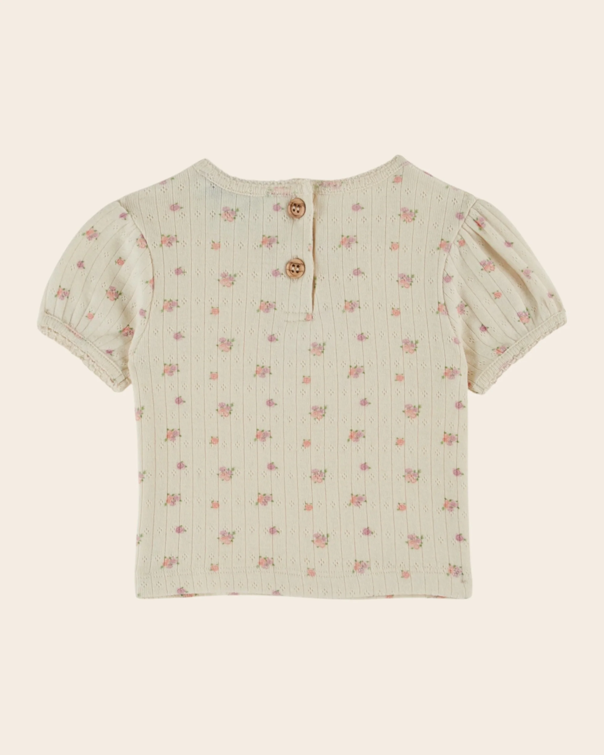Tee-shirt en côtes et mailles pointelle de coton biologique et modal crème imprimé en all-over de fleurettes aux couleurs pastels. Les motifs ajourés de losanges permettent une meilleure respirabilité et un rendu visuellement raffiné.